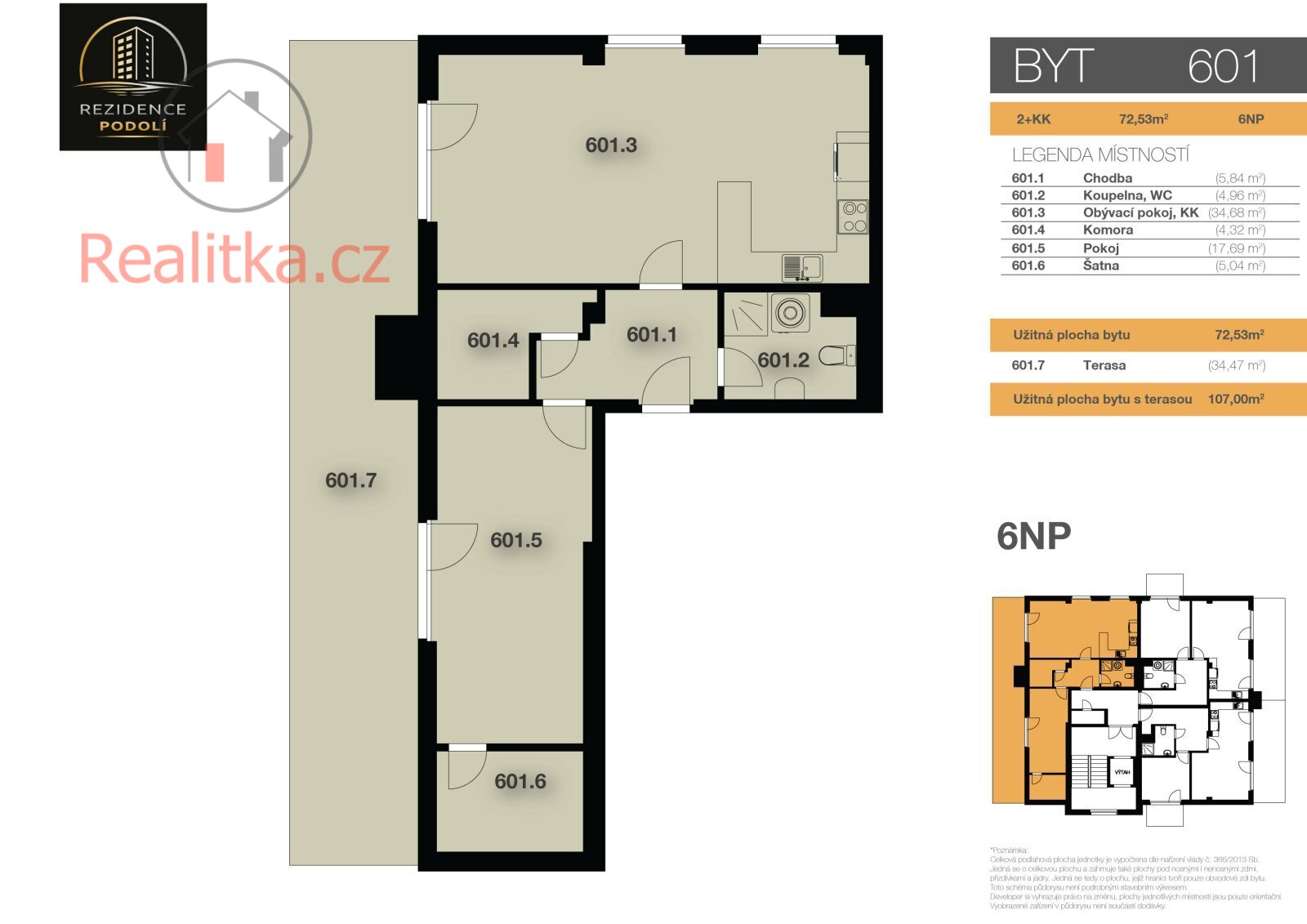 Exkluzivně nabízíme k prodeji nový byt o dispozici 2+kk s terasou o celkové výměře 107 m2 situovaný v moderním projektu Rezidence Podolí. Jednotka se nachází se v 6. nadzemním podlaží a je tvořena vstupní halou, obývacím pokojem,ložnicí, koupelnou s WC a terasou (34 m2).