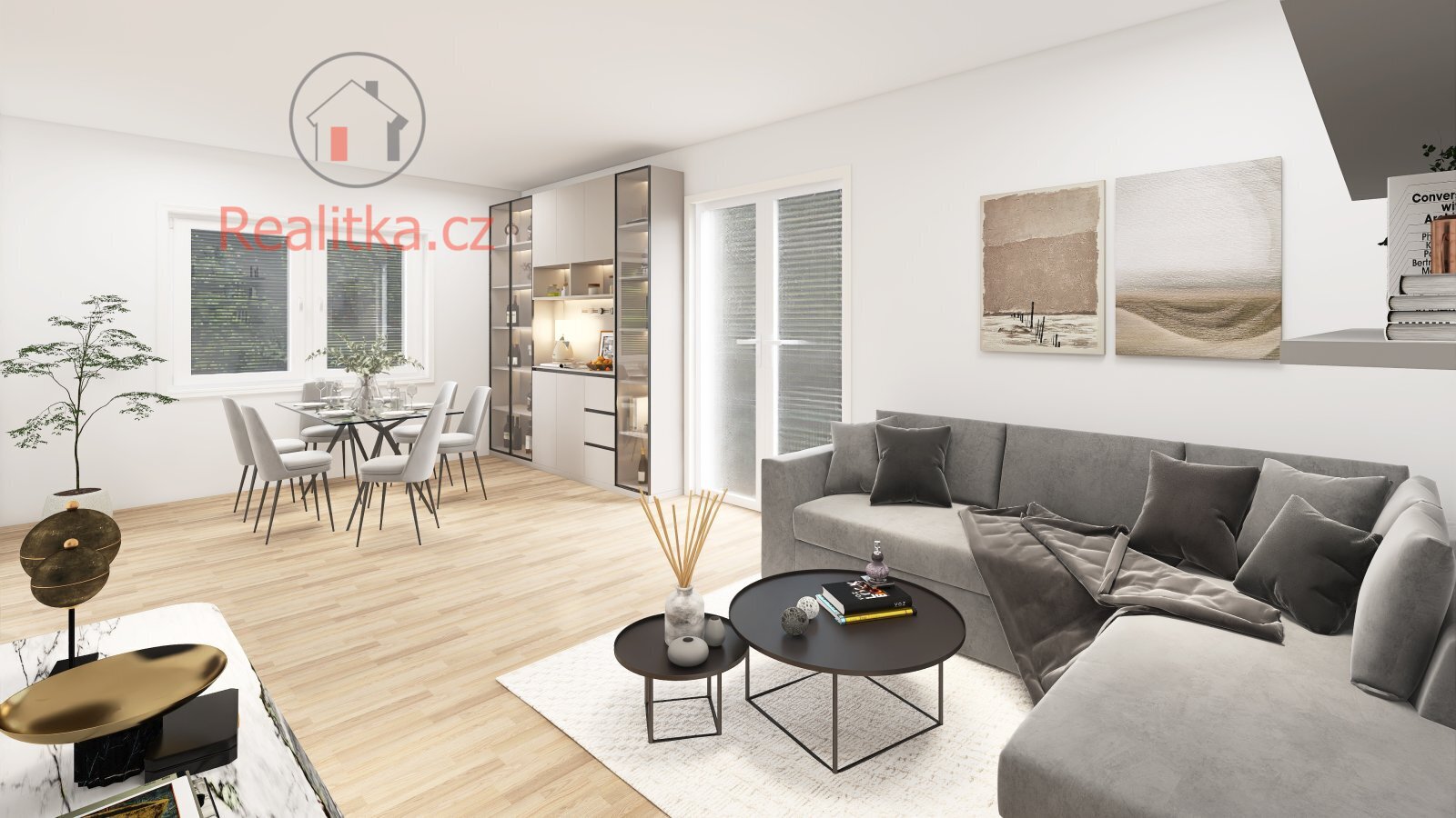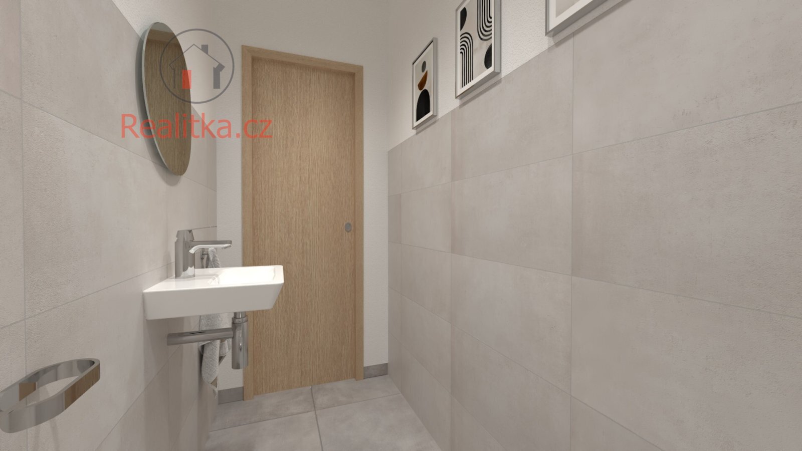 • Přízemí: Prostorná chodba, technická místnost, WC, obývací pokoj s chytře odděleným kuchyňským koutem a terasa navazující na obývací pokoj, čímž se vytváří plynulý přechod mezi interiérem a exteriérem.