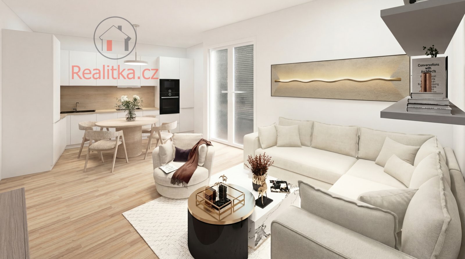 • Přízemí: Prostorná chodba, technická místnost, WC, obývací pokoj s chytře odděleným kuchyňským koutem a terasa navazující na obývací pokoj, čímž se vytváří plynulý přechod mezi interiérem a exteriérem.