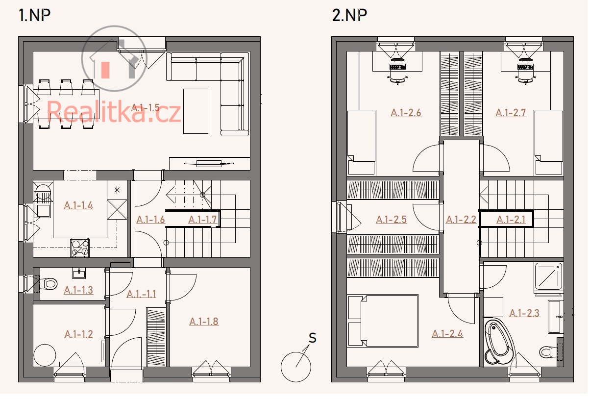 • 1. patro: Nabízí tři samostatné pokoje, prostornou šatnu a nadstandartní koupelnu s vanou, sprchovým koutem, dvoj-umyvadlem a tepelným žebříkem.