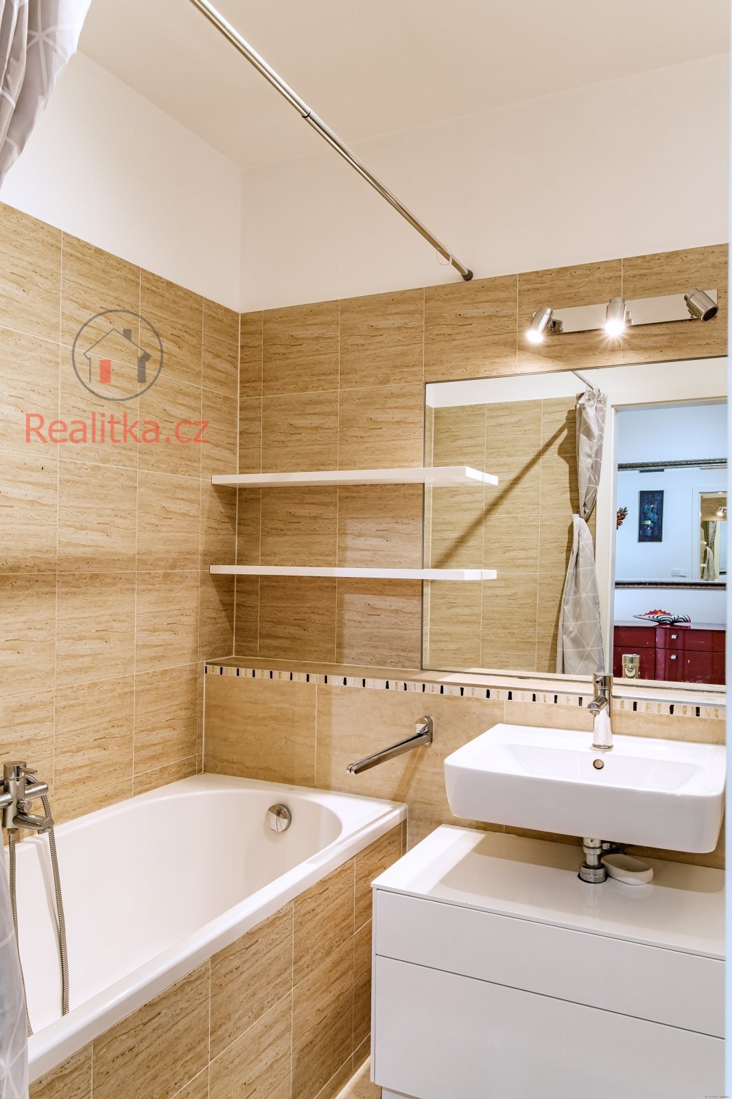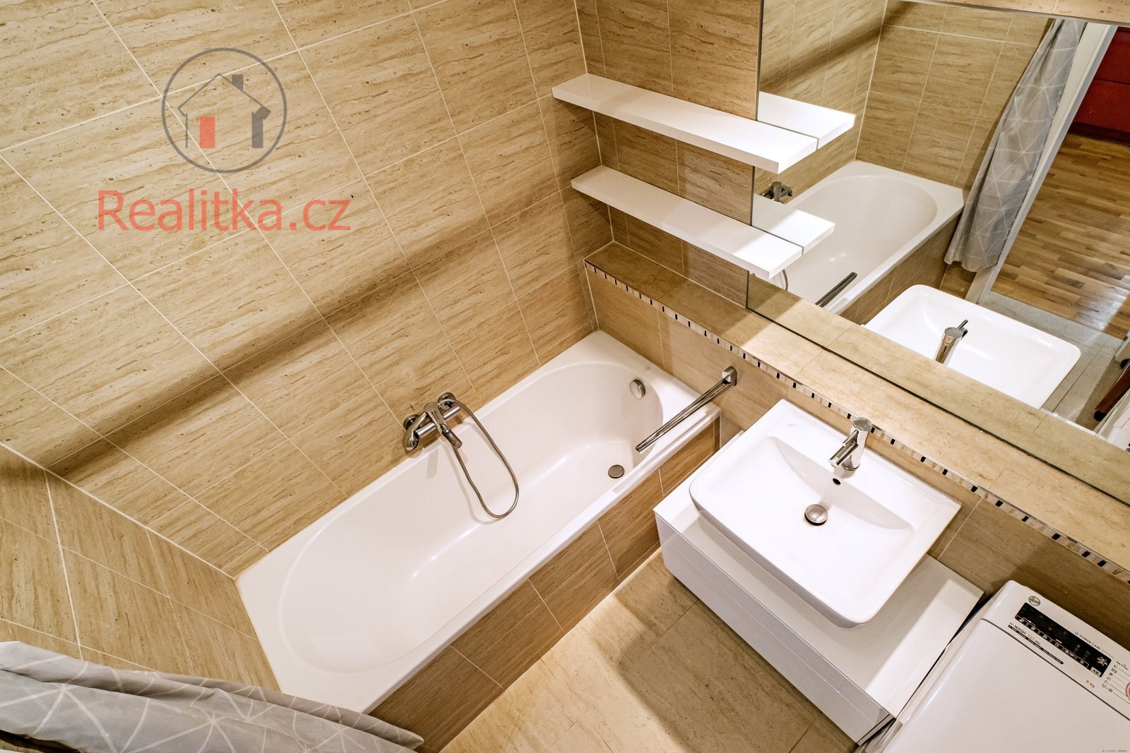 • Koupelna: Vana, podlahové vytápění a žebřík na sušení, keramický obklad a dlažba