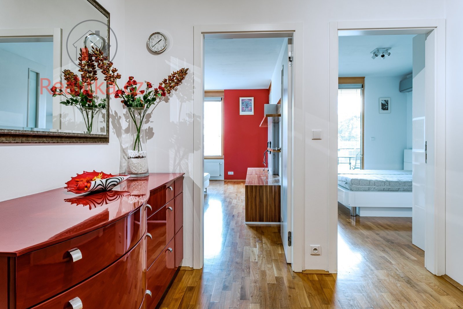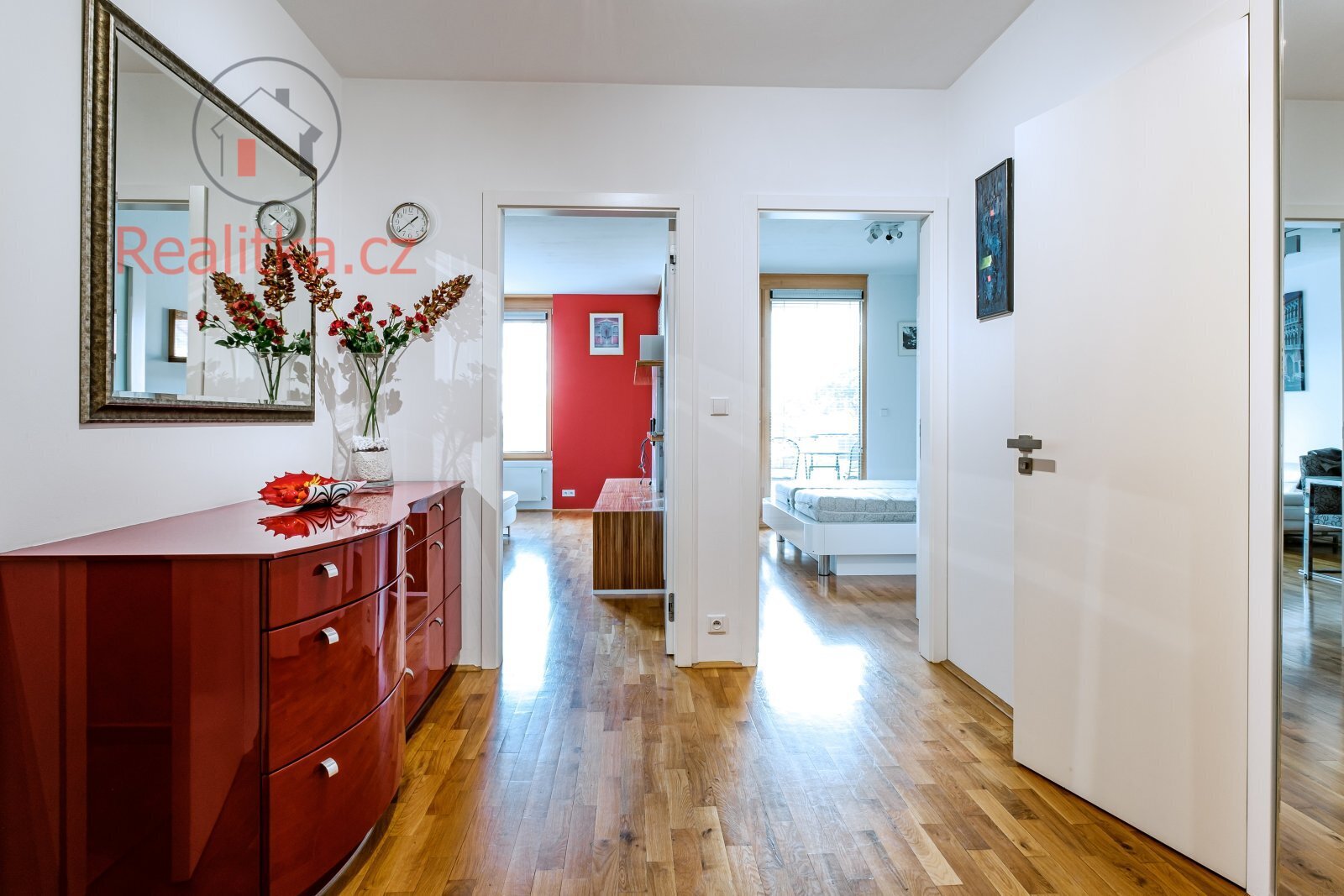 • Dveře: Interiér hladká dýhovaná s bílým nástřikem, obložkové zárubně. Vstupní dveře bezpečnostní, protipožární.