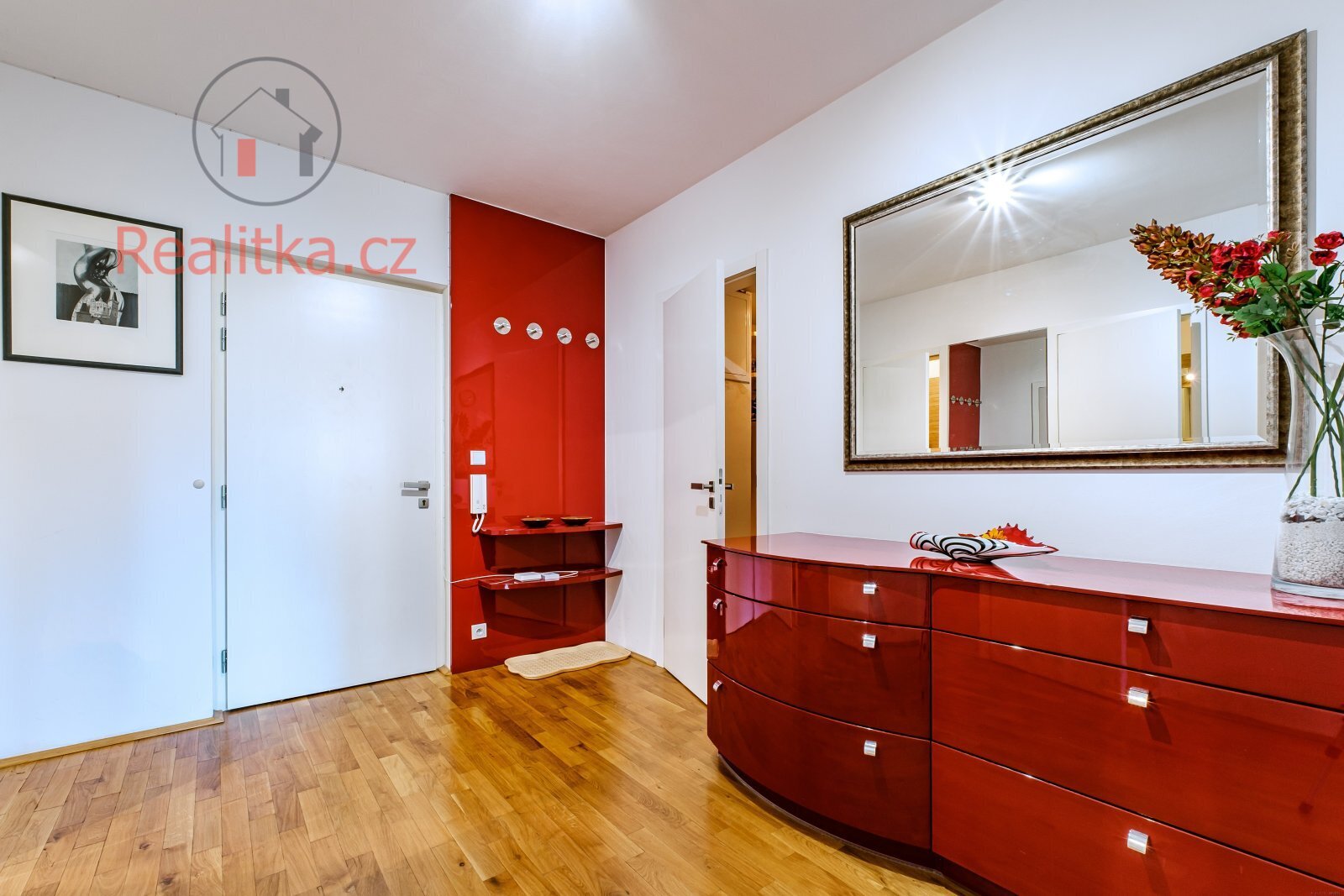 • Kuchyň: Nová kuchyňská linka v dekoru bílého lesku, vybavená vestavnou lednicí, myčkou, troubou, dvouplotýnkovou varnou deskou, odsavačem par a mikrovlnnou troubou.